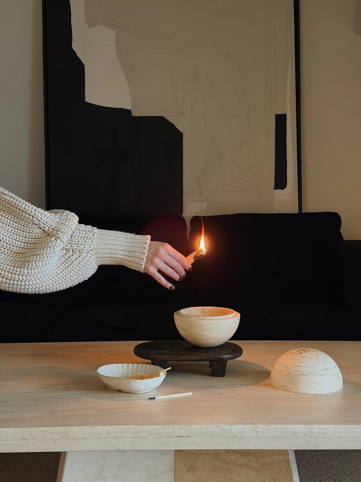 Beim Räuchern mit Kohle empfehlen wir das Unterlegen von Räuchersand. Bei Palo Santo & Kräuterbündeln die angezündete Spitze nach oben stellen, sodass es zu keinen Verfärbungen des Travertins kommt.